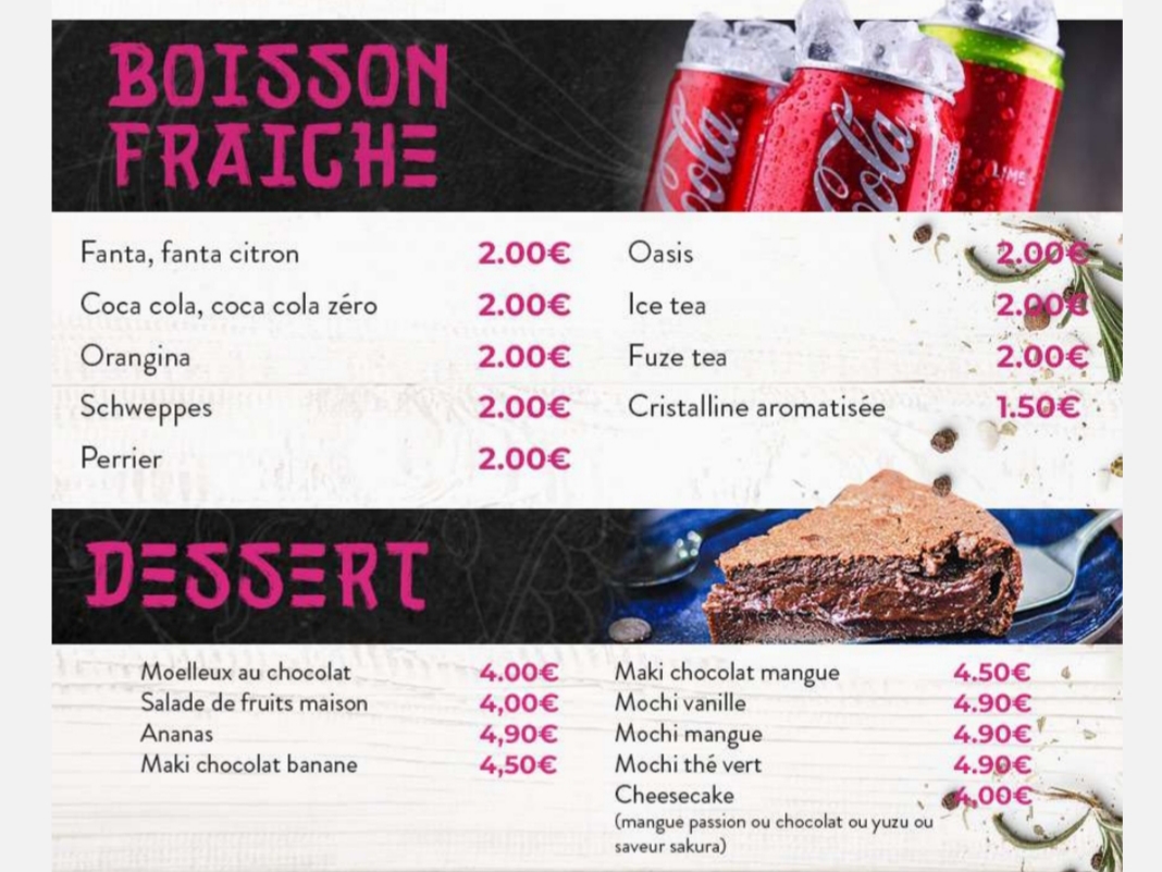 The TATTAKI section offers a delightful choice of premium grilled items like tuna, salmon, and beef at €8 each. Don't miss the diverse DESSERTS ranging from chocolate mochi to tropical fruit salads, all at a sweet €4.